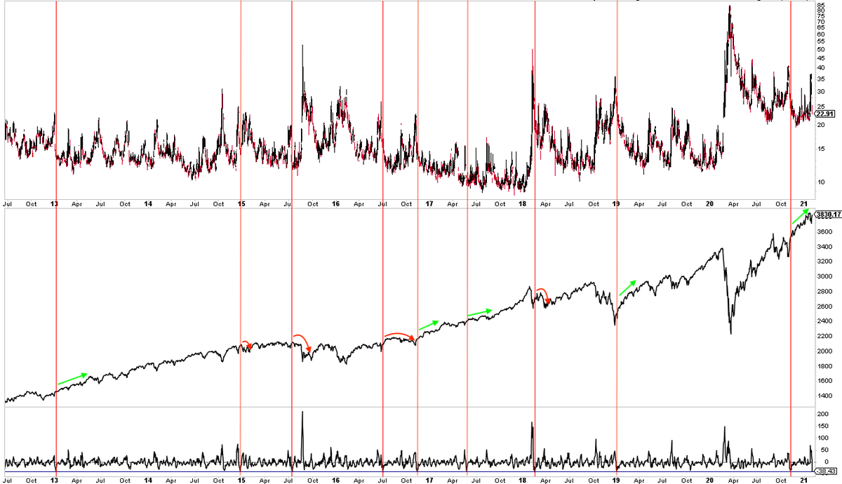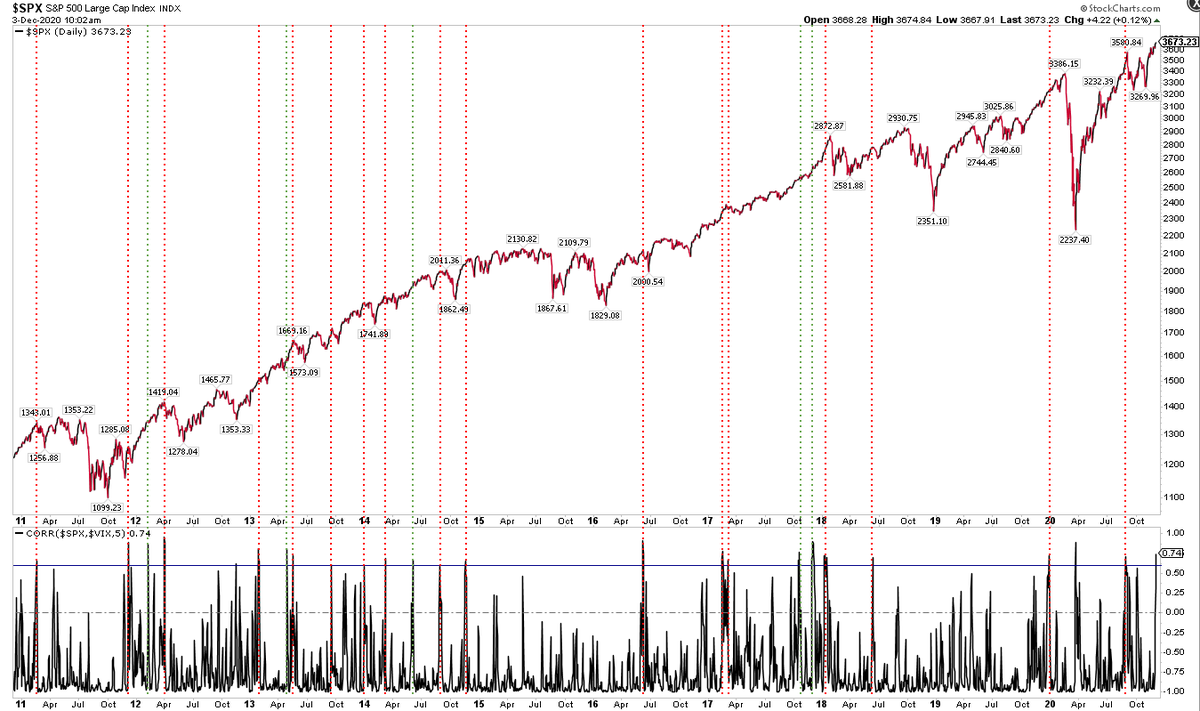 $SPX and $VIX have been unusually positively correlated. That has mostly been bad news (red lines) but not always (green lines)
