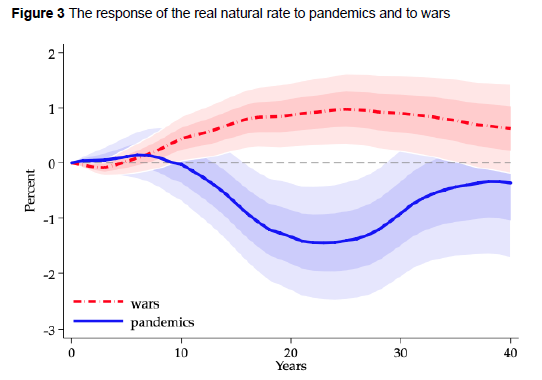 Temos esse trabalho que estuda o efeito de pandemias passadas na taxa de juros, com base nas 15 maiores pandemias desde o século XIV.