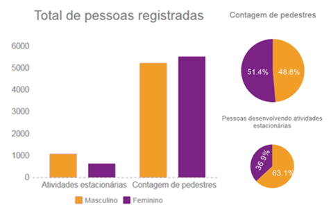 Entre outros dados, o estudo mostrou que apesar de as mulheres representarem 51,4% das pessoas em movimento na área de estudo, constituíram apenas 36,9% das pessoas desenvolvendo atividades estacionárias.