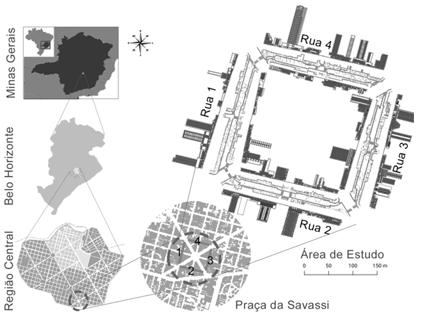 Levantamentos de campo foram realizados para mapear os atributos físicos da área de estudo, como as calçadas, fachadas de edifícios, mobiliários urbanos e arborização. Observações foram realizadas para identificar o padrão de comportamento das mulheres no espaço ao longo do dia.