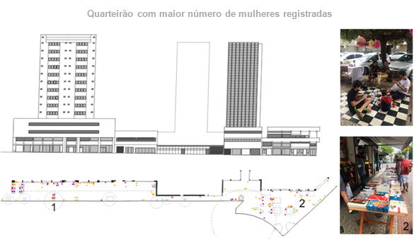 Em contraposição, o quarteirão mostrado abaixo foi o que apresentou a maior quantidade de mulheres. Ele apresenta uma rica diversidade de usos.