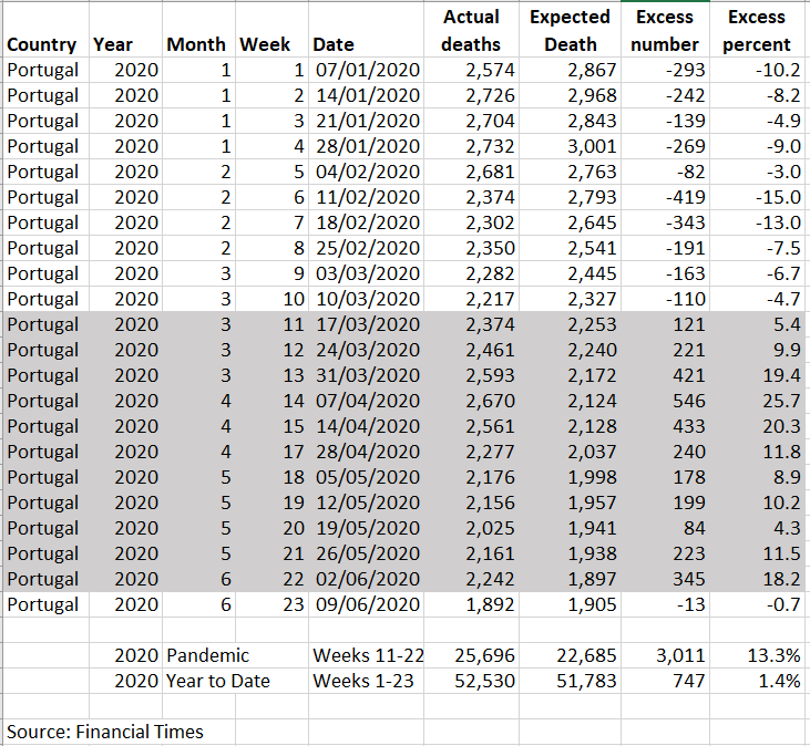 Here are the 2020 figures @FT has for Portugal. They show that the 3,000 excess refers to the period from week 11 to week 22 and that this was 13% higher compared to the recent average for this period.