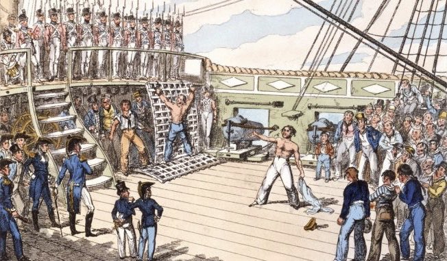 El culpable se colocaba con el torso desnudo apoyado en un cañón o en el cabestrante y recibía los azotes estipulados, siempre en presencia de un oficial y por lo general de toda la dotación. Eso para los marineros, porque los soldados de la guarnición tenían sus propios castigos