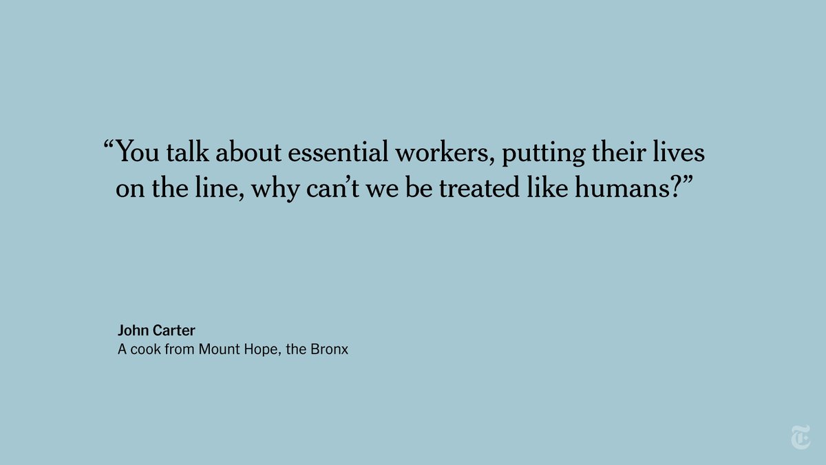 Another worker, John Carter, who has diabetes, said he was so scared of getting the virus that he took 2 weeks of vacation so he could stay home from his job as a cook. But when that ended, he said, his boss told him, “You have to come to work — or.”