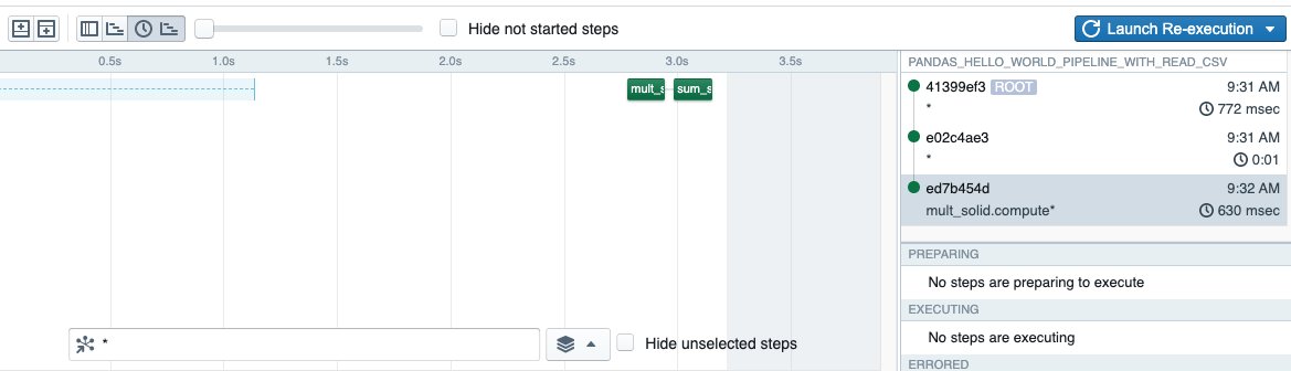 First: a reskin and new navigation scheme for our frontend, Dagit. We think that Dagit sets a new standard for frontend in data tools. We also have dramatically improved rendering perf for large pipelines (1000s of nodes) along with the ability to subselect with a condense syntax