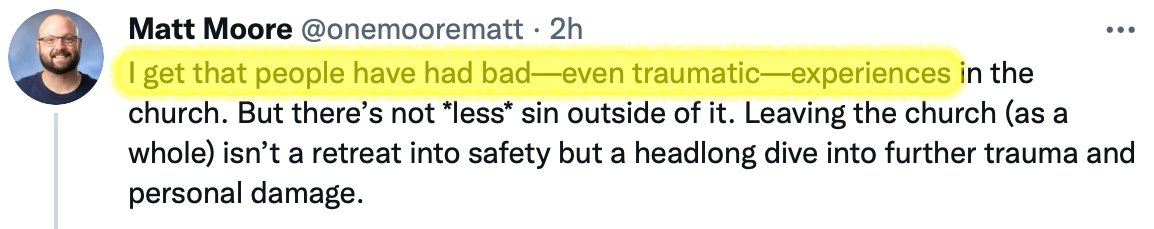 For those who don't recognize them, Moore here is obliquely responding to the "exvangelical" movement that's been blossoming over the past few years.