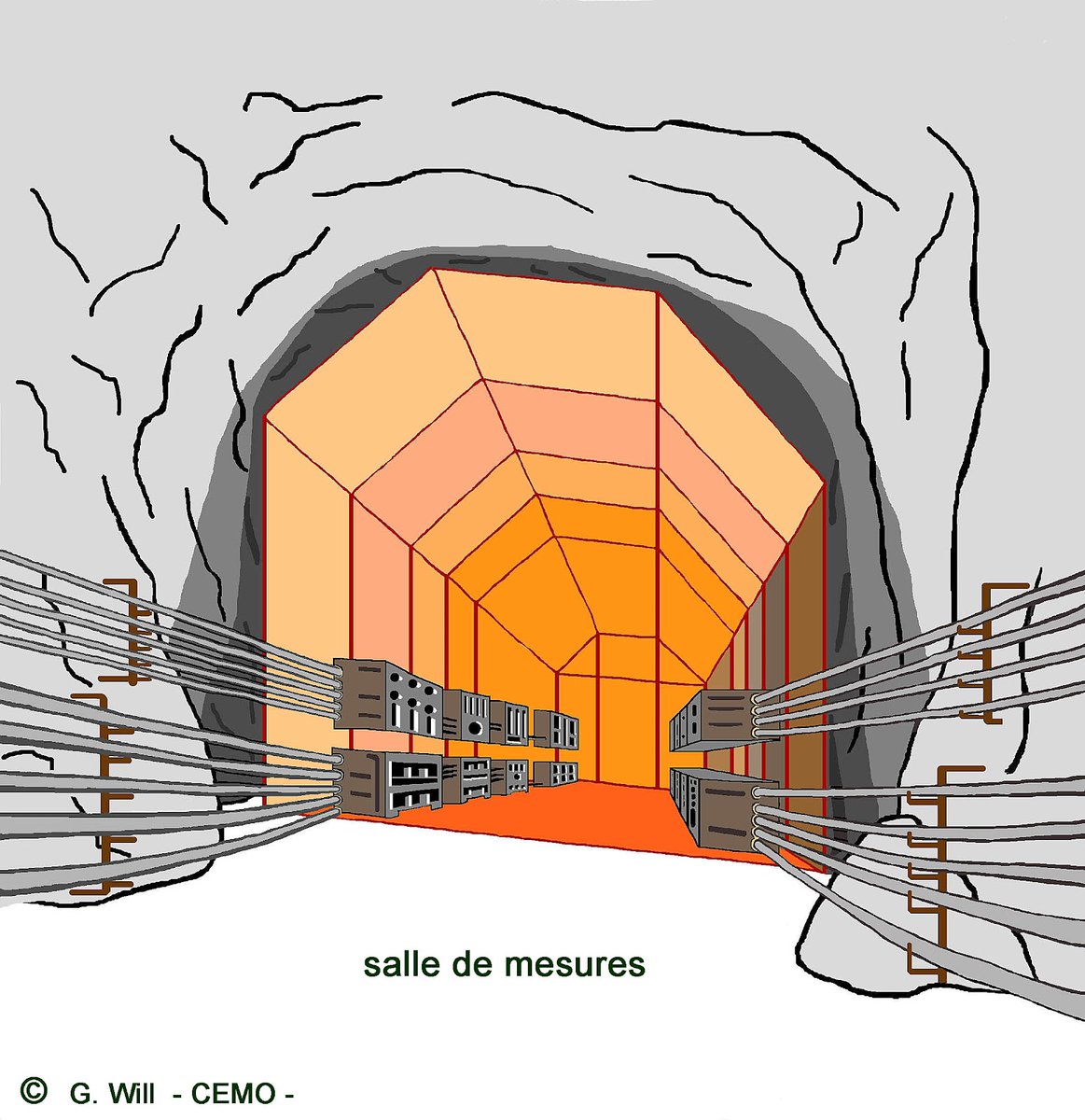 Taillées dans les cavités latérales de la galerie principale, des " cages de faraday ", tapissées de feuilles de cuivre, protègent les instruments de mesure (sismographe, mesures électromagnétiques, rayonnements gamma…) contre les interférences électromagnétiques.
