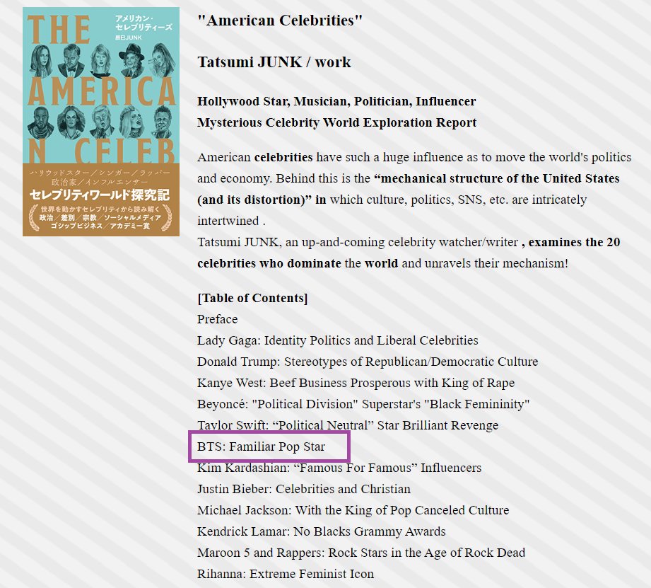 The author is JUNK Tatsumi, a pop culture watcher. He has written various media articles about celebrities, music, movies & dramas around the United States.