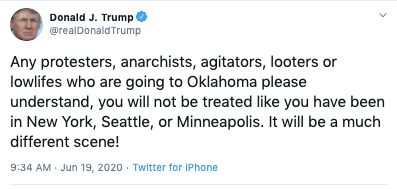 Also looks like the president's threat to protestors at the Tulsa rally came in response to a Fox Business segment about "little government pushback" to protests in the Pacific Northwest.