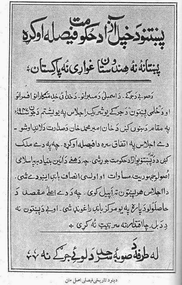 The resolution demanded the British to offer the option of independence for Pashtunistan, comprising all Pashtun territories in British India, rather than choosing between the independent dominions of India and Pakistan.