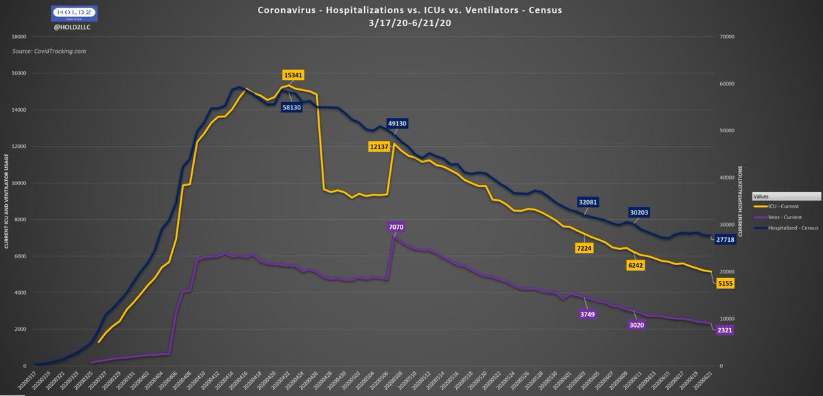 Graph 4: Coronavirus - Census for Hospitalizations vs. ICUs vs. Ventilators
