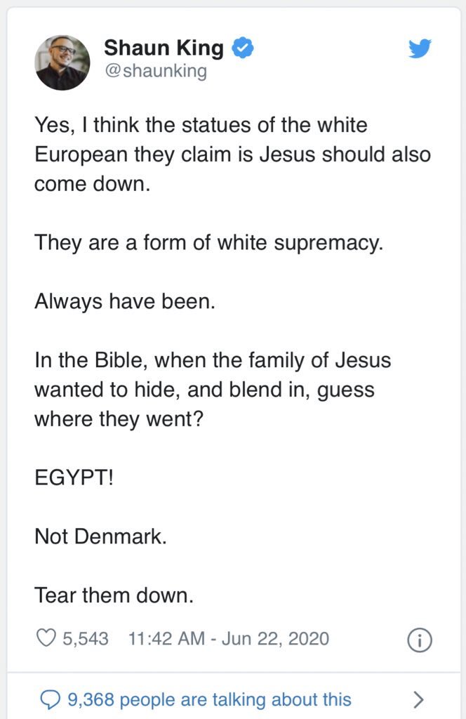 The people pulling the puppet strings seek total societal collapse. They sure seem like they want civil war. Imagine groups of rioters tearing down statues of Jesus like @shaunking told them to. Christians will not allow that to happen. Shaun is putting lives in grave danger.