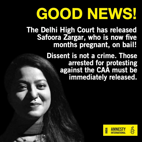 GOOD NEWS: The Delhi High Court today granted bail to Safoora Zargar, a member of the Jamia Coordination Committee on humanitarian grounds.