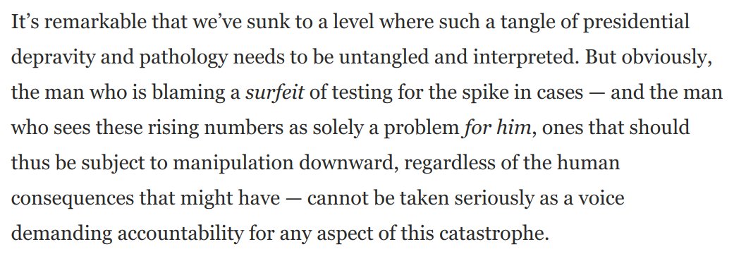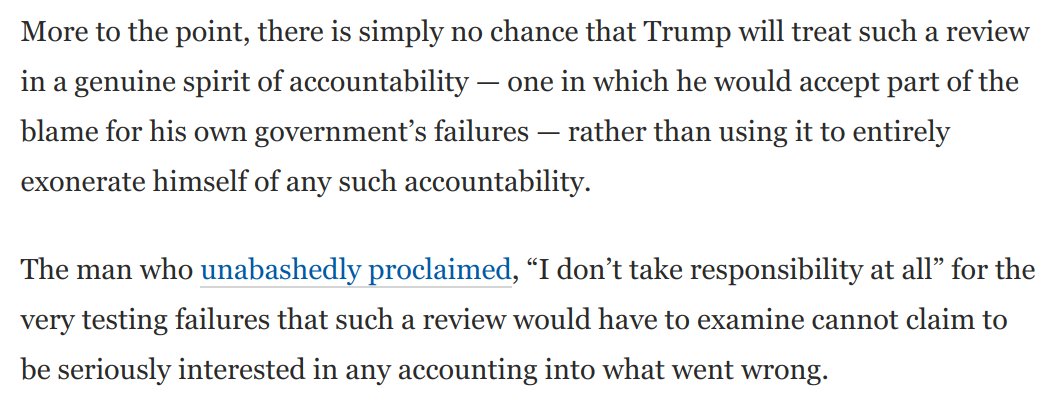 But the man who said, "I don't take responsibility at all," and actively wants *fewer* tests to keep cases down, doesn't suddenly get to be a voice of accountability.