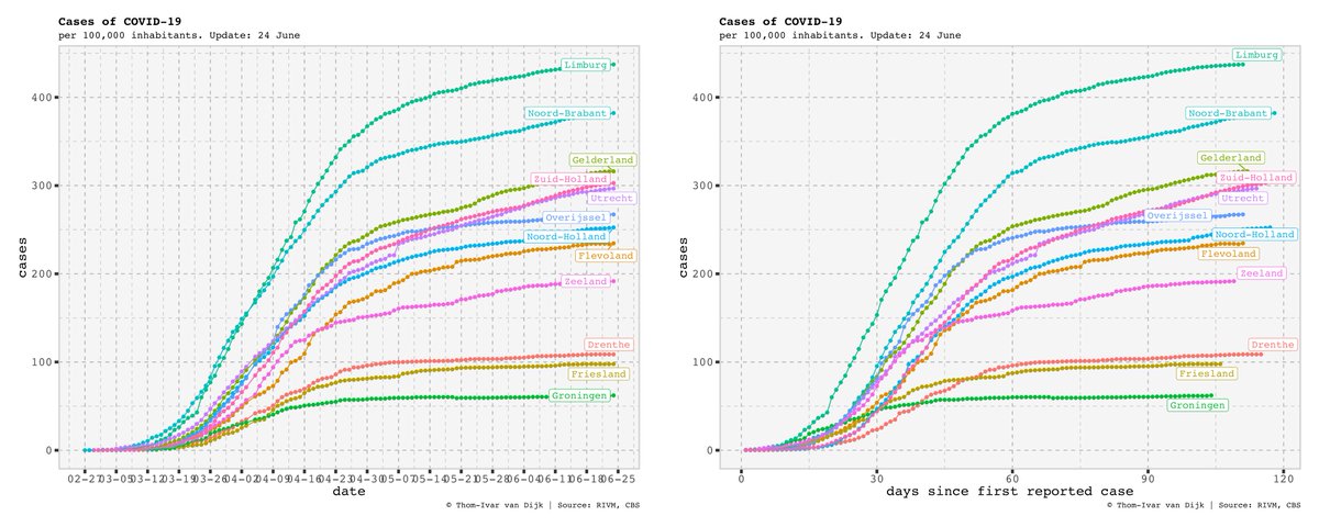Cases of #COVID19 per Dutch province per 100,000 inhabitants over time: