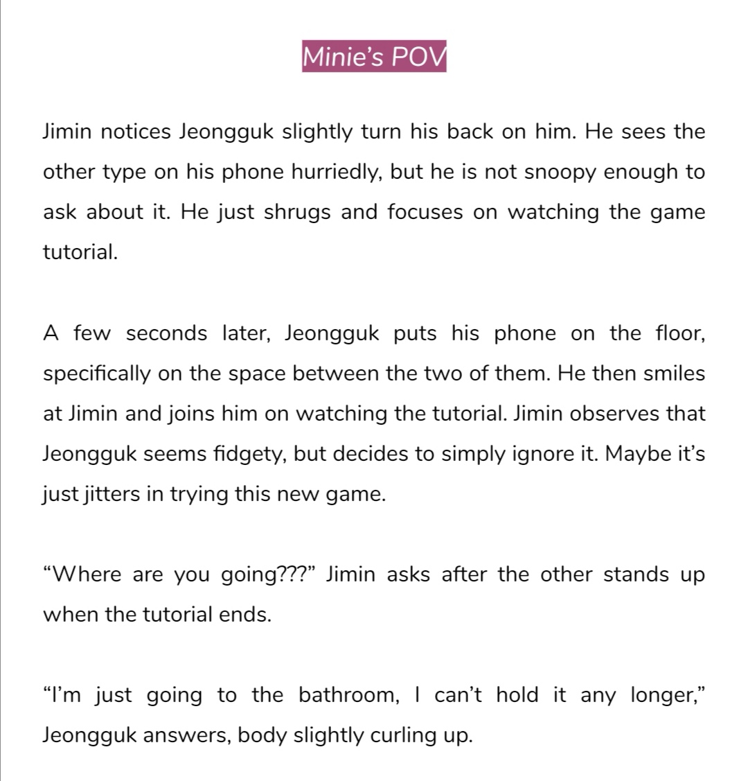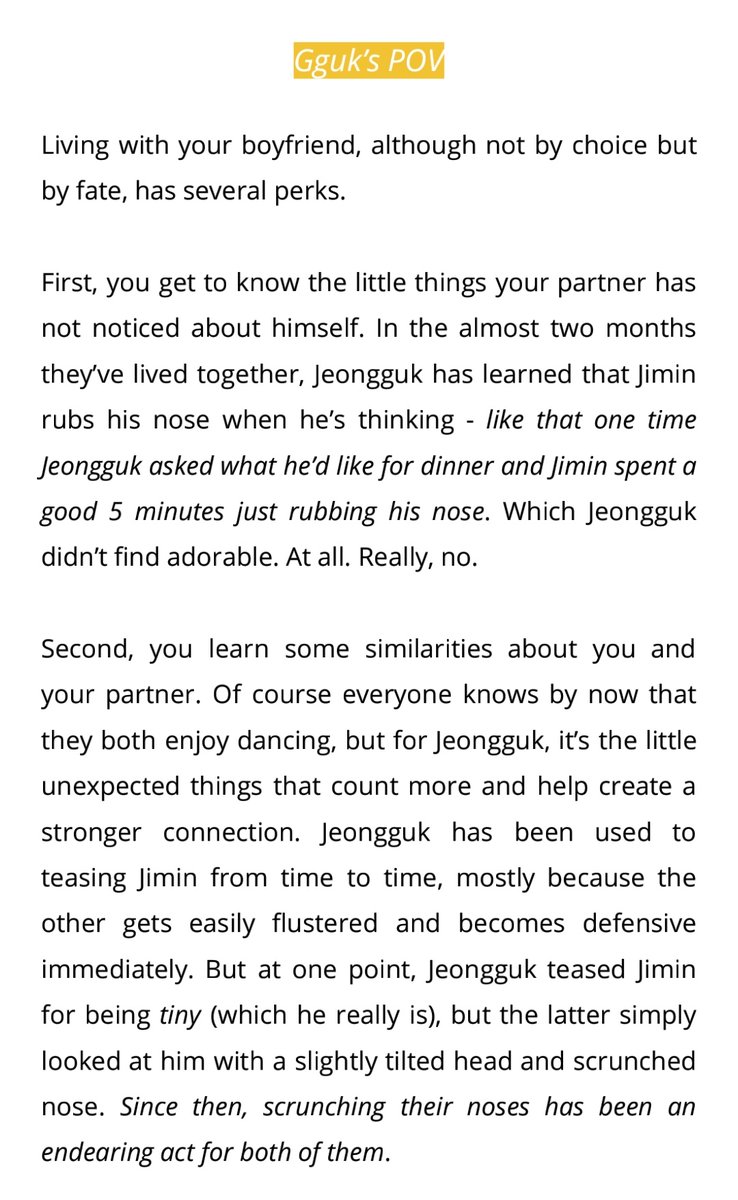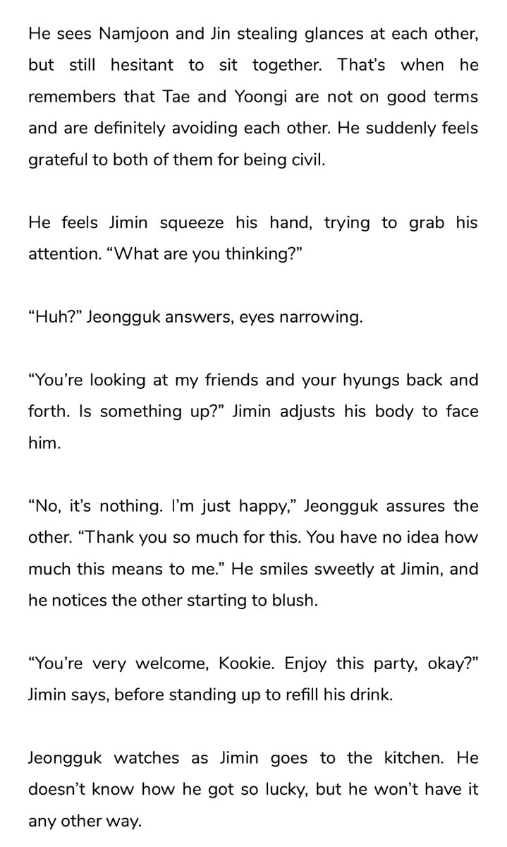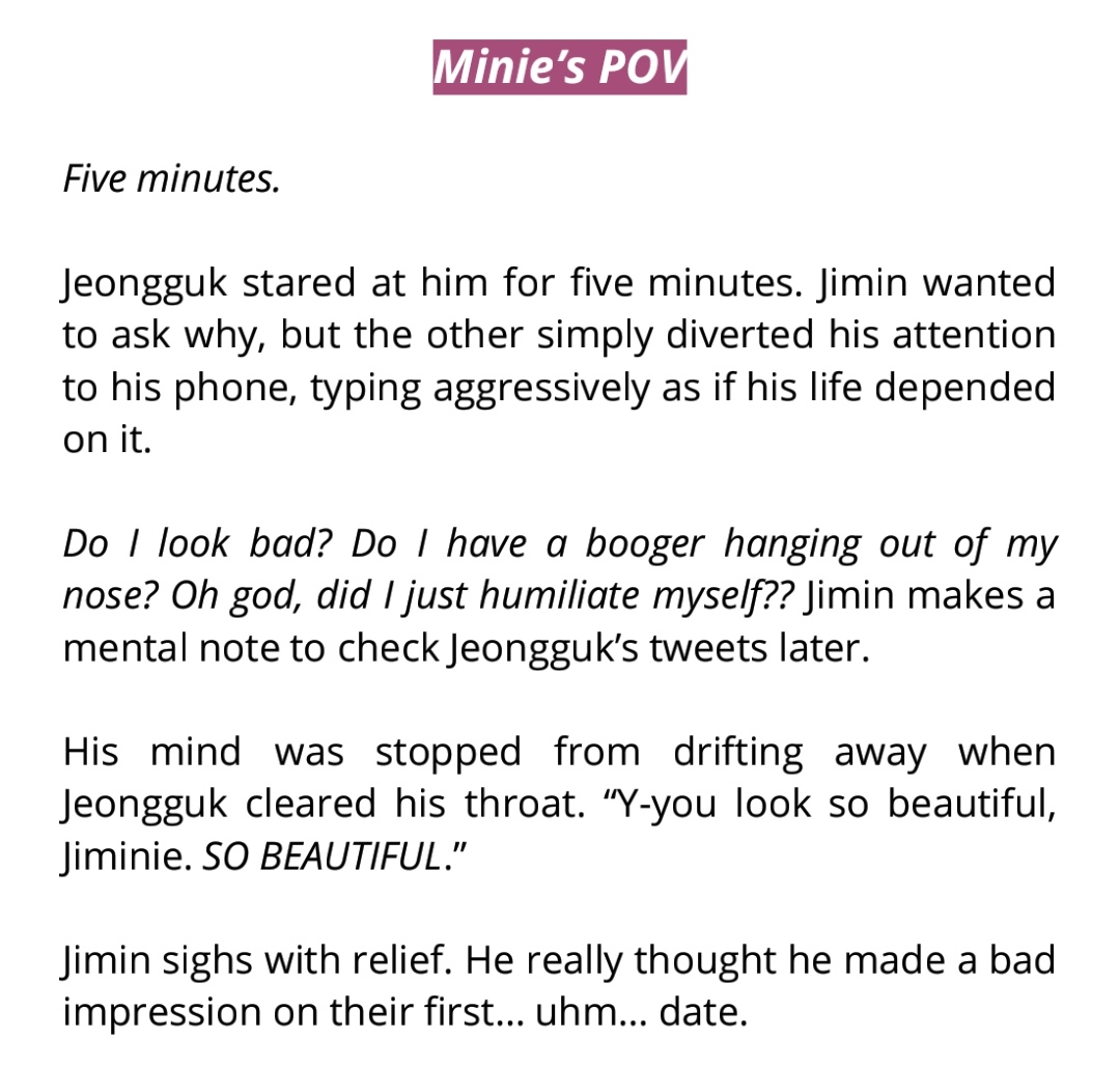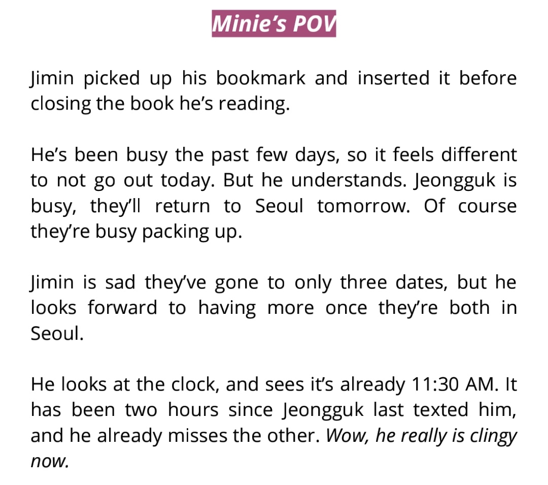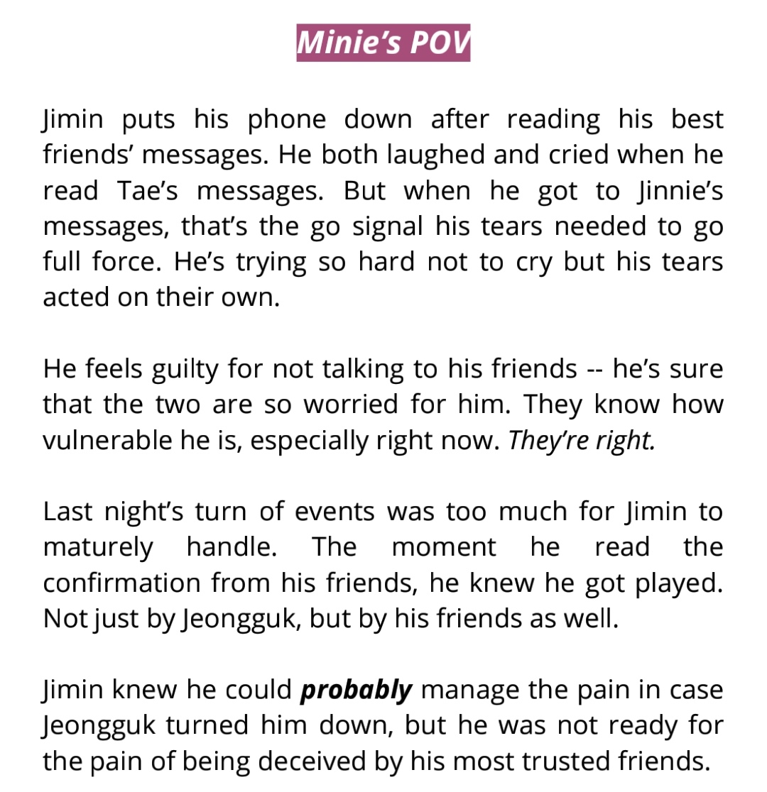 — i include narration from other characters (not gguk/minie) bc i want the readers to see things from their perspective & to know their feelings as well ❤️