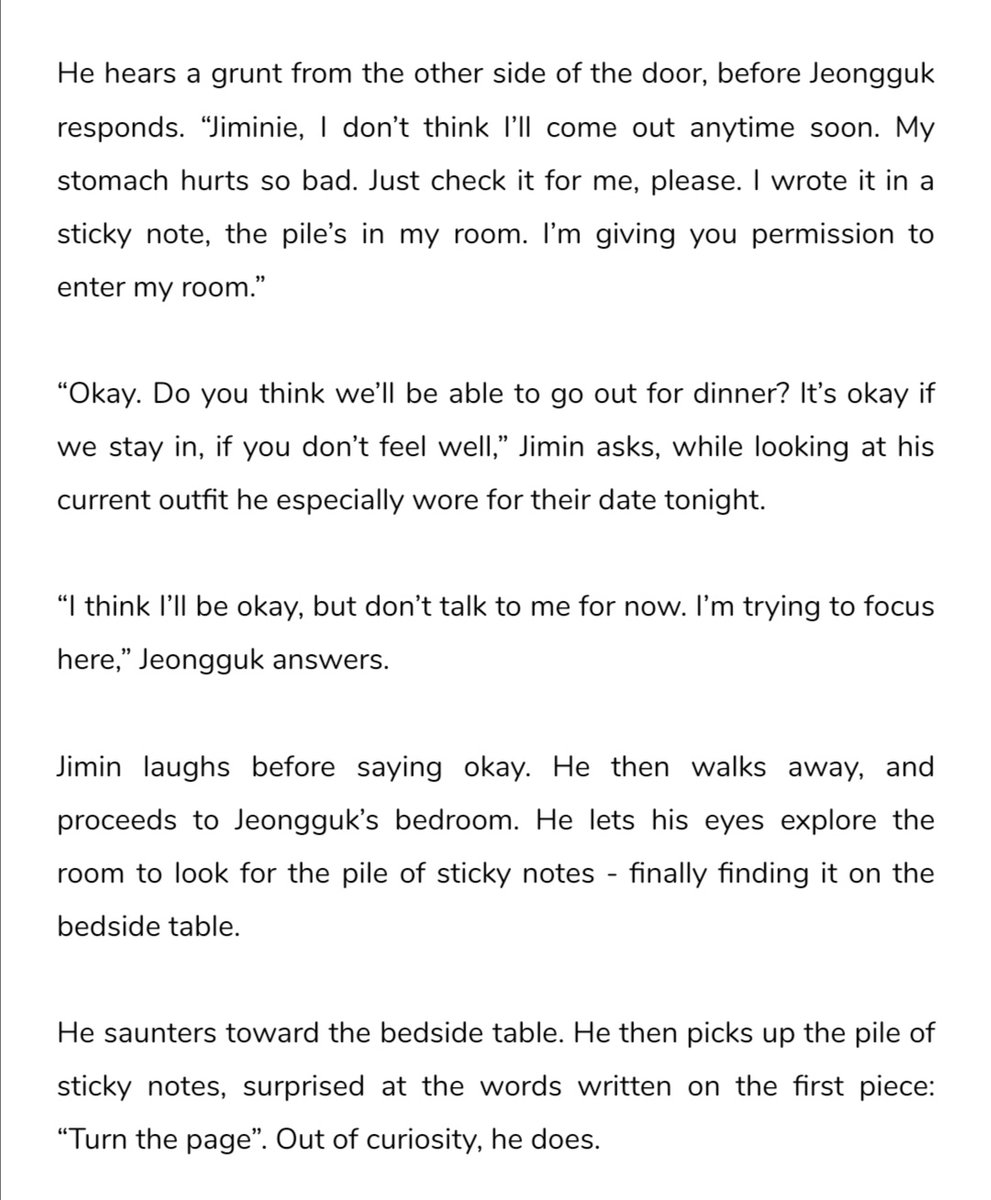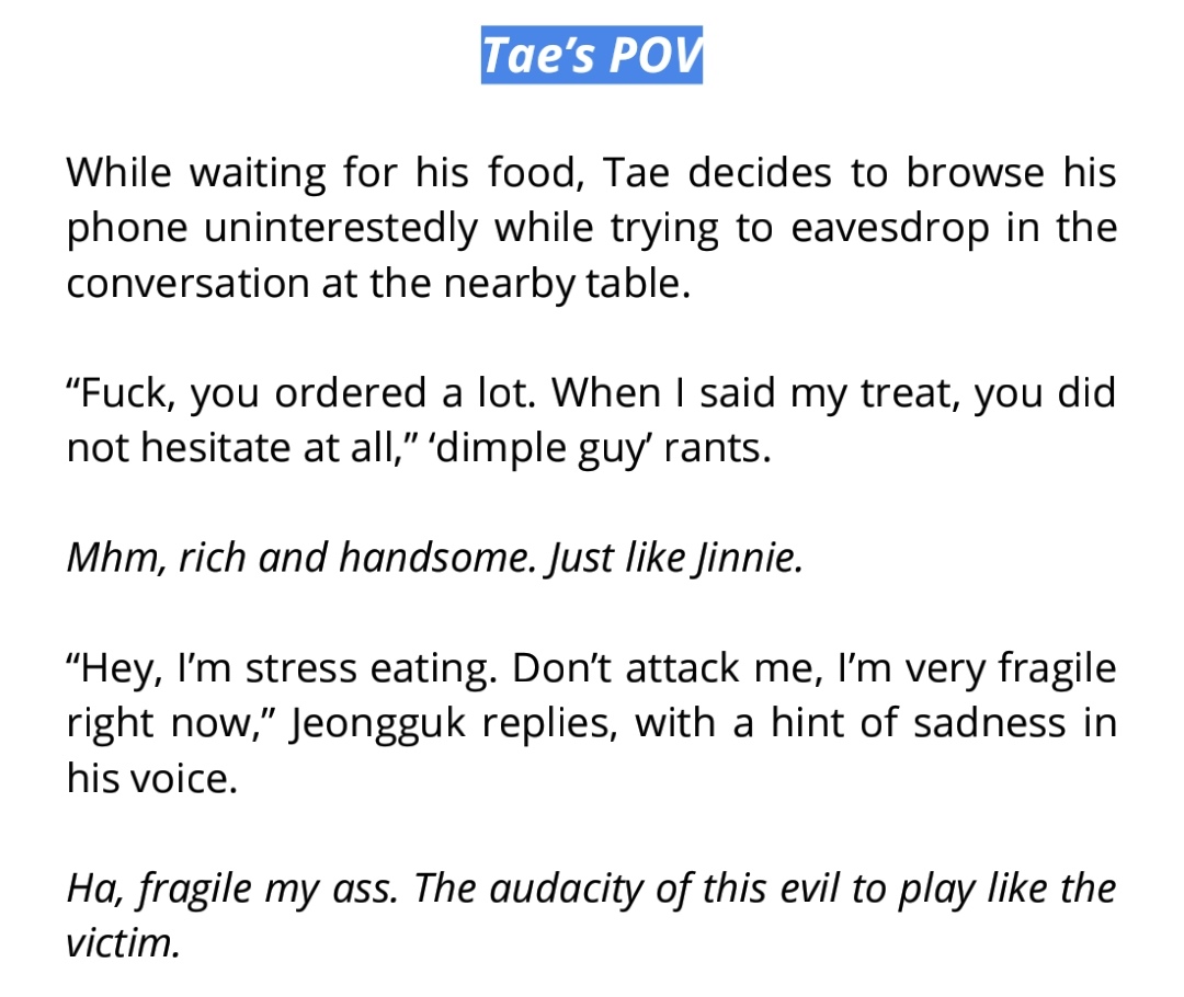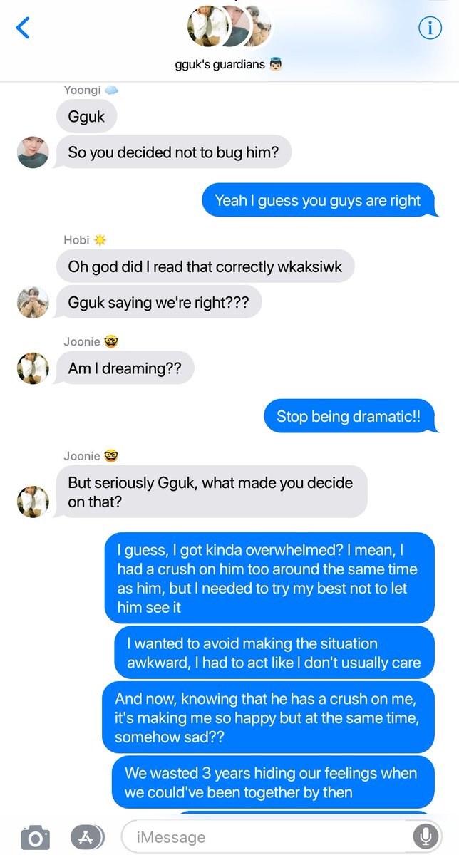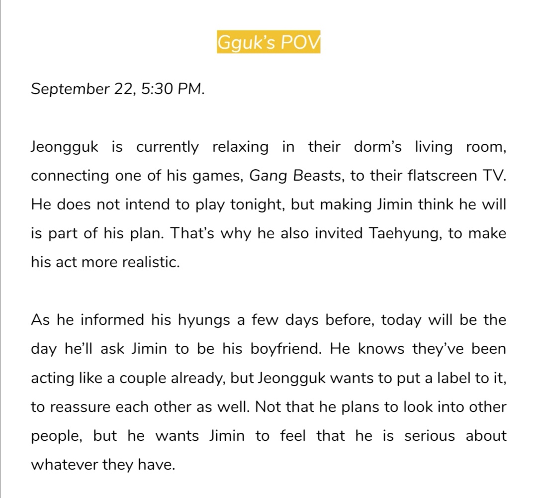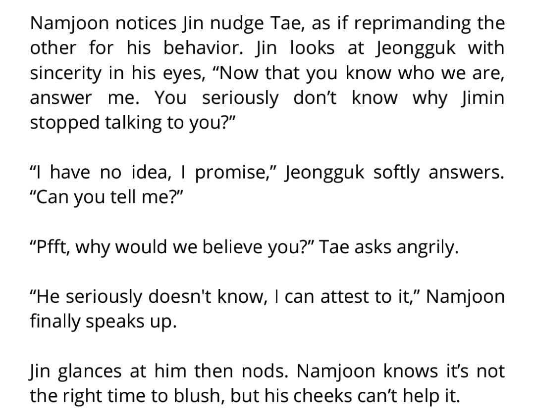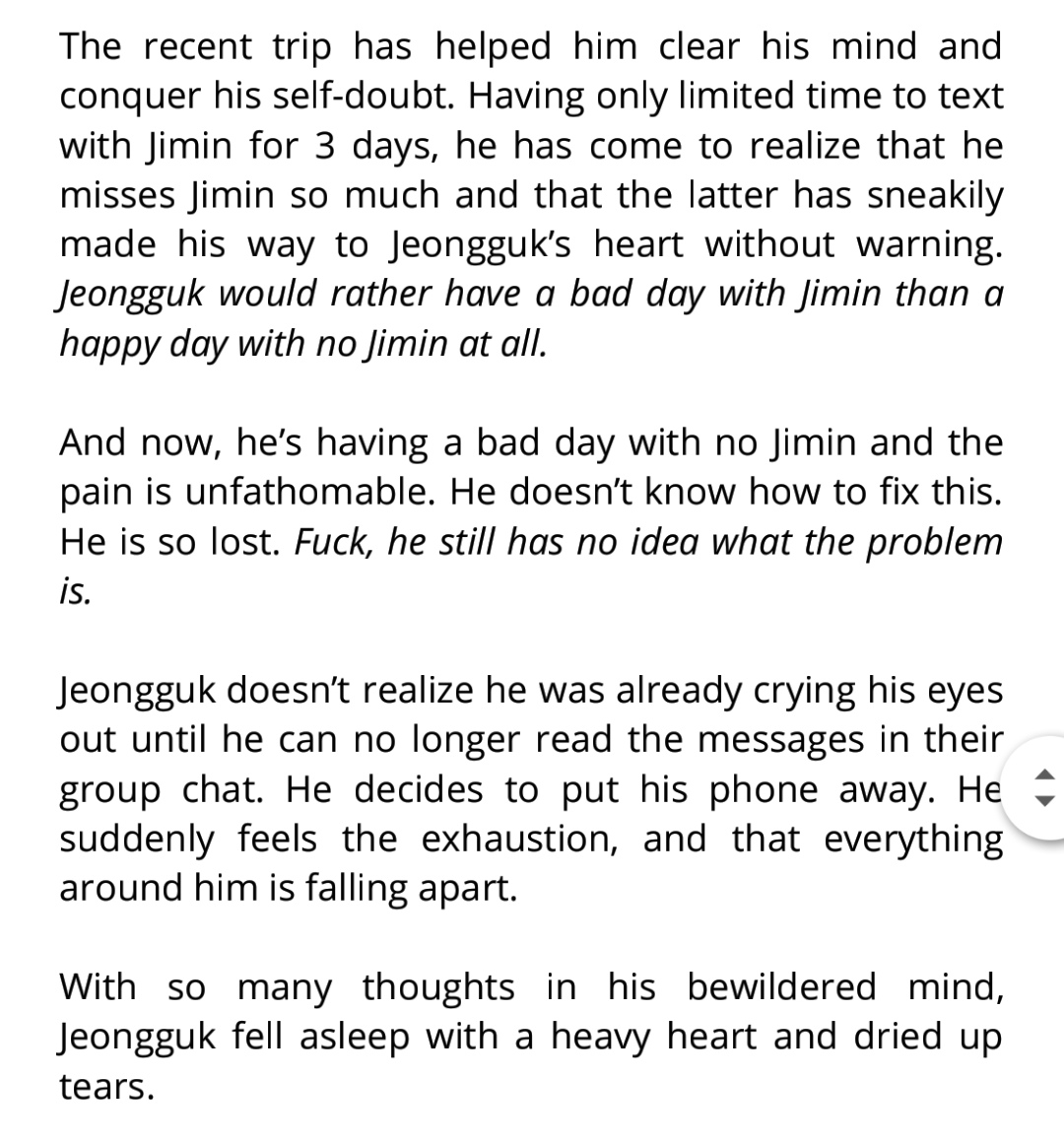 — i include narration from other characters (not gguk/minie) bc i want the readers to see things from their perspective & to know their feelings as well ❤️