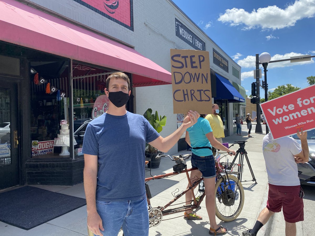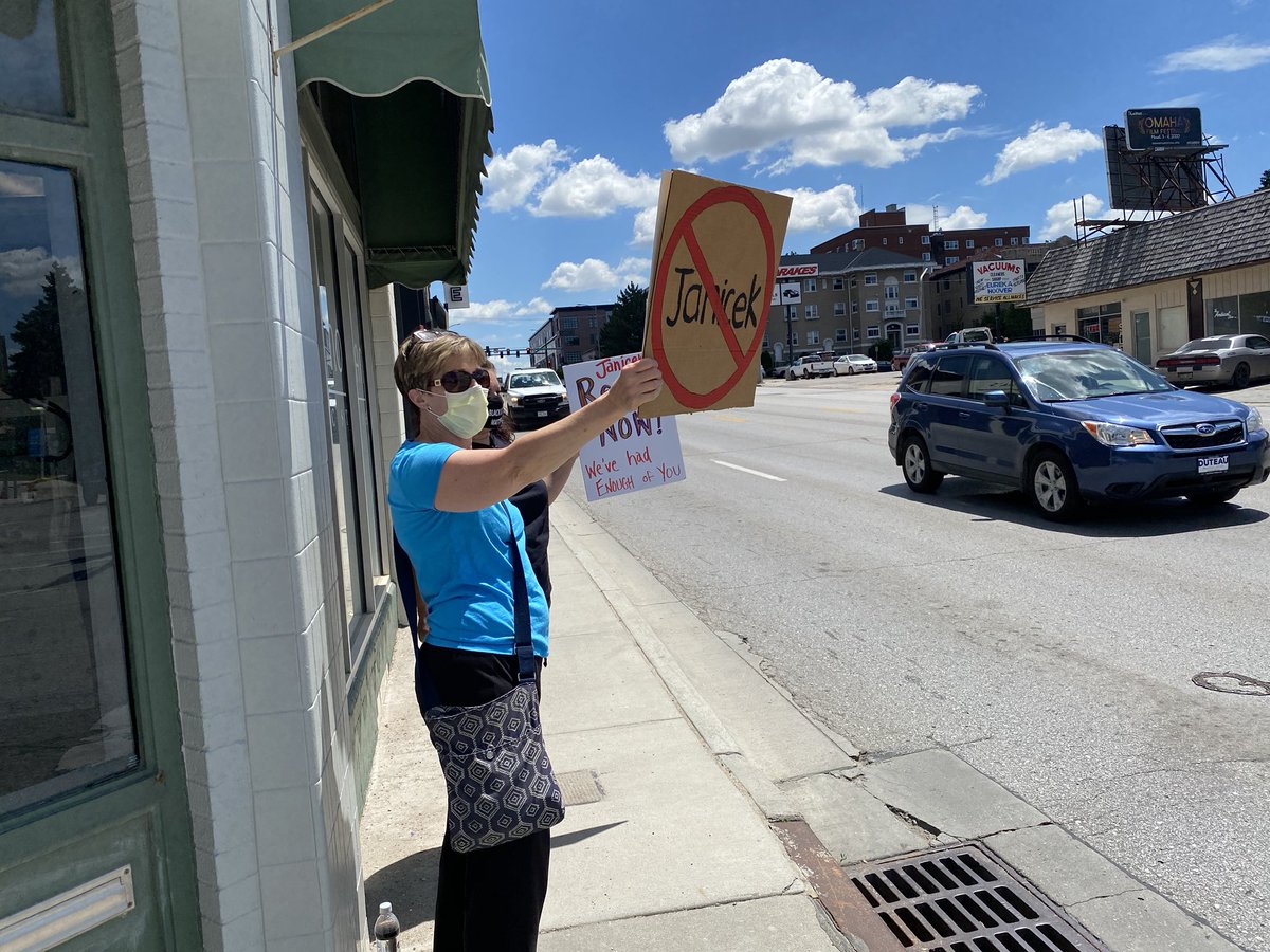 In front of @CupcakeOmaha, Scott Williams, 38, held a sign calling on Janicek to step down.