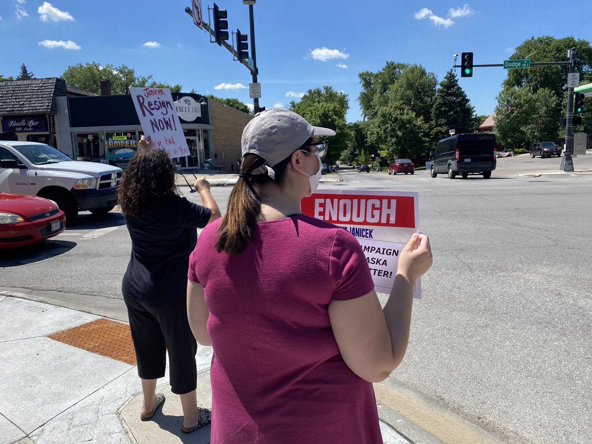 Talked a bit ago to one of the first protesters here, Deb Manning of Omaha, 54. She said she is taking a stand against sexual harassment. She said Janicek needs to quit Nebraska’s Senate race before he irreparably damages his businesses.