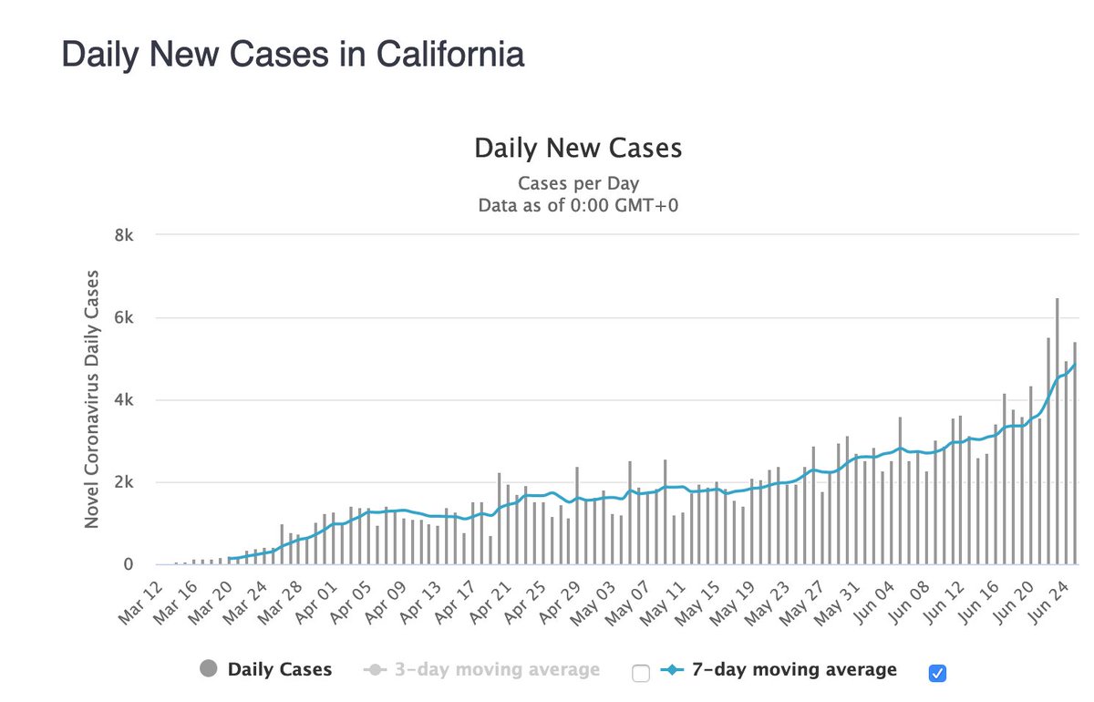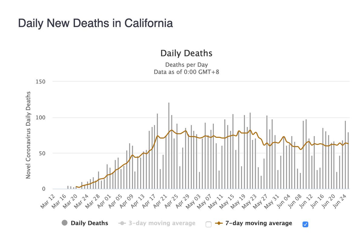 While some states are showing "spikes," CA is not spiking since its never got its infection rates flattened. However, even CA has a flattened death curve. They led the US with 80 deaths yesterday.