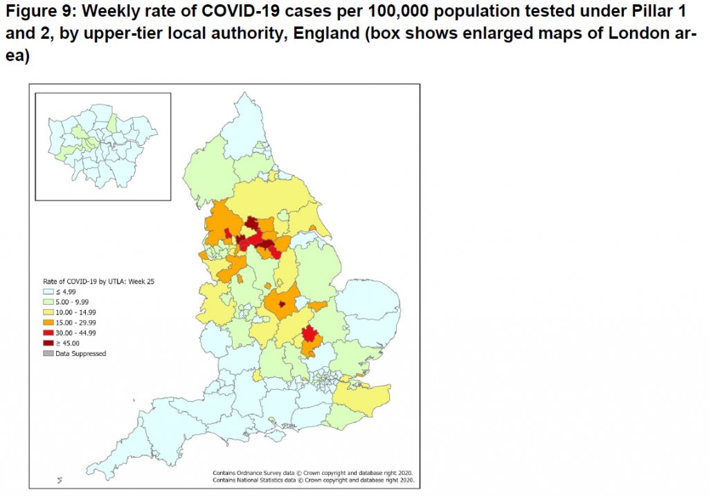 Why the dispartity? This comes from the difference in how tests are reported. Coronavirus.data.gov only reveals so-called ‘Pillar 1’ tests (those in the NHS), wheres the PHE maps include both Pillar 1 and Pillar 2, the latter under the auspices of NHS Test and Trace.