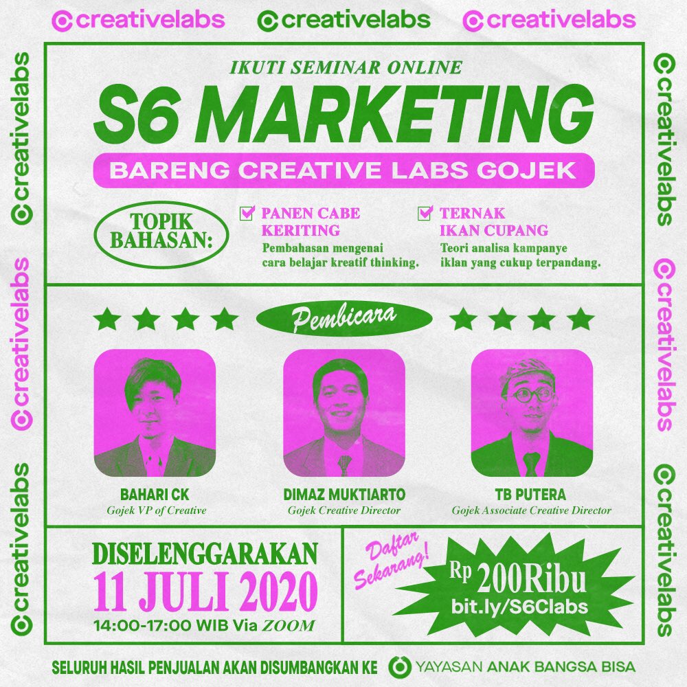 Ini ada beberapa foto behind the scenes iklan-iklan gojek yang akan kita bedah. Kita akan bahas mulai dari brief, konsep hingga ide-ide yang tidak jd dieksekusi. Seluruh penjualan tiket akan disumbangkan ke Yayasan Anak Bangsa Bisa. Klik bit.ly/S6Clabs