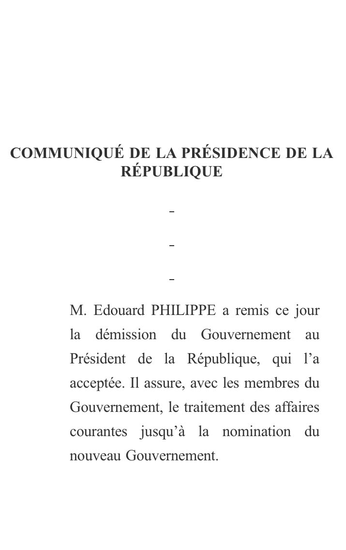 French PM Edouard Philippe has resigned. A new PM will be announced in the next few hours, according to the Elysée Image