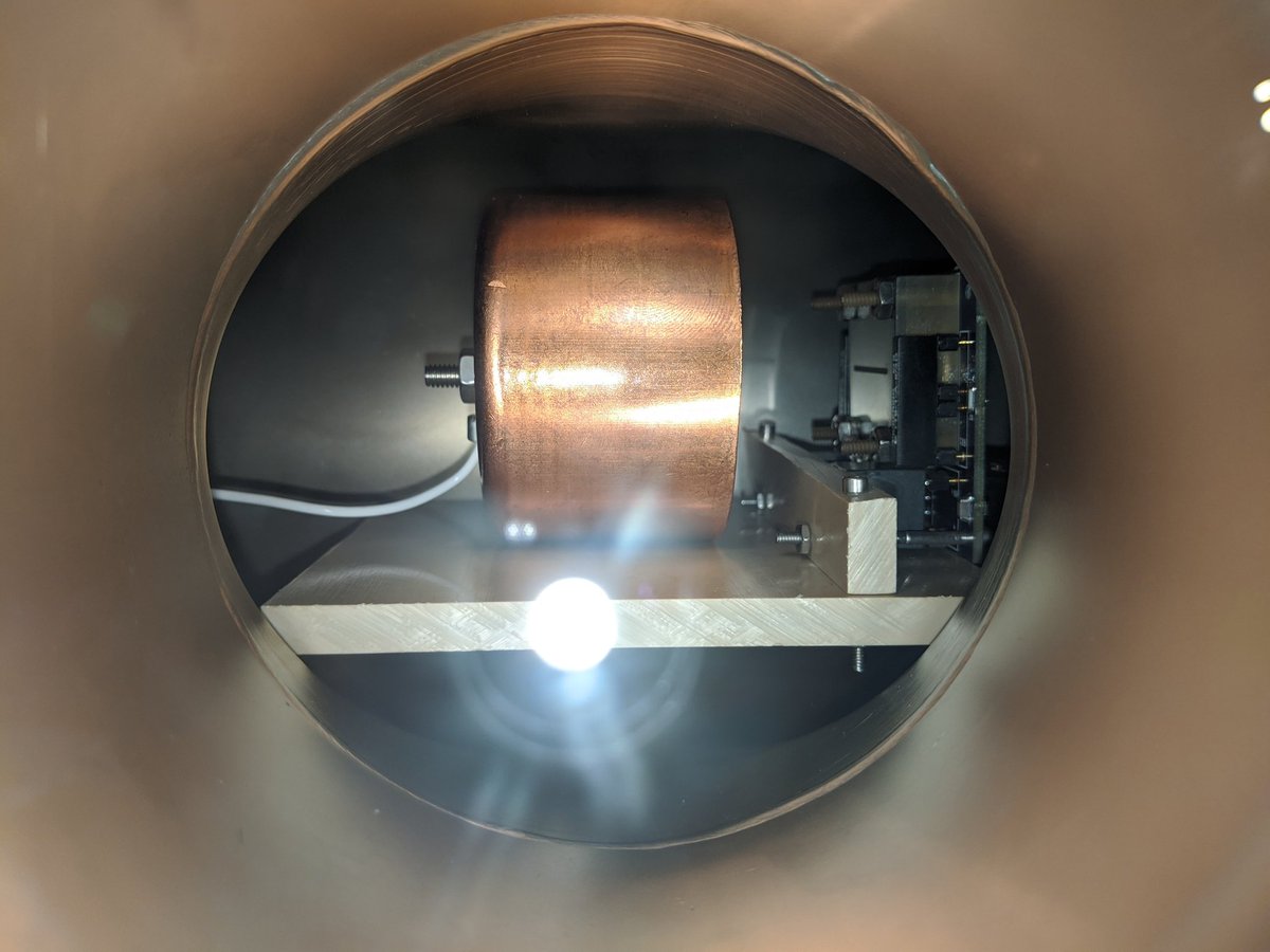 The thruster and Faraday cup stand are in place. With this angle, I can see if I can capture the very faint glow of the ion emission from the slit if it works. The system is sealed and ready to go. Time to start the pumpdown!