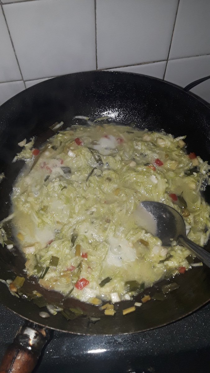 Luego agrega el calabacin y mezcla, es importante que unas muy bien el cebollin al calabacín, para que absorba los sabores... acto seguido agrega el pimenton o aji.