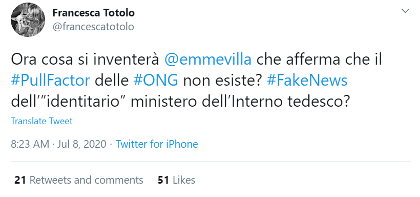 ⛔️🇪🇺 Francesca Totolo e gli identitari: "Dai, Emmevilla, provaci ancora una volta che le Ong davanti alle coste libiche non sono un pull factor. Stavolta lo dicono persino il Ministero dell'Interno e i servizi segreti tedeschi!"