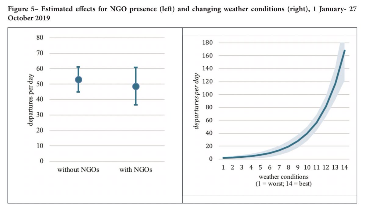 Ma in un paper che abbiamo pubblicato mesi fa lo spieghiamo: le partenze dalla Libia risentono delle condizioni meteo e di altro, NON della presenza delle Ong.