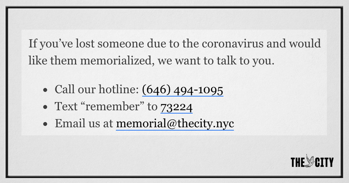 Over the next month, we’ll be contacting these folks to vet them and get them started on the project. If you’d like to help, email: memorial@thecity.nyc.