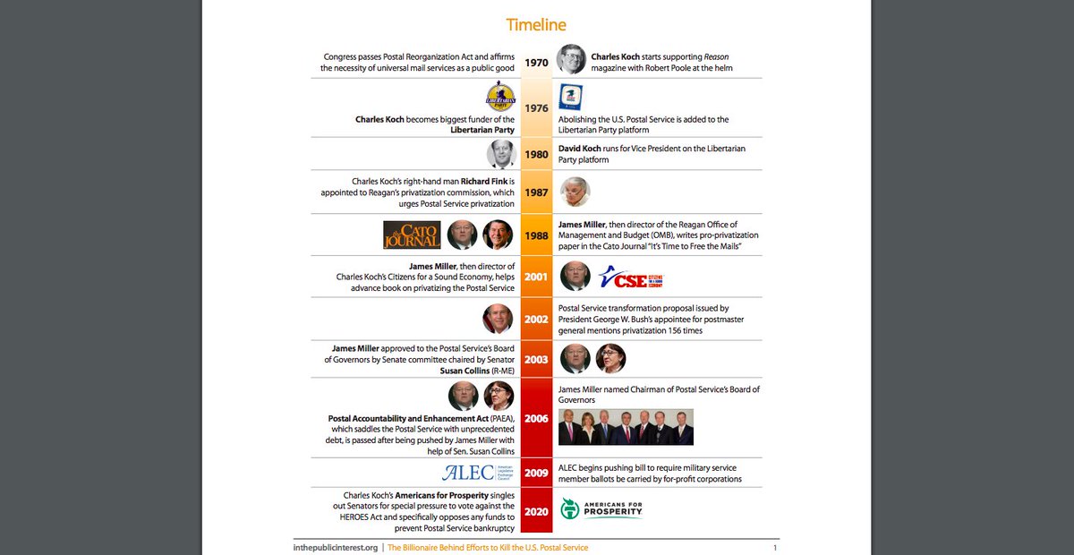 Koch Docs curator @thelisagraves is out with a report on Charles Koch's attempts to kill off the US Postal Service, since the 1970's. Published by @PubInterest @itstruenorth: