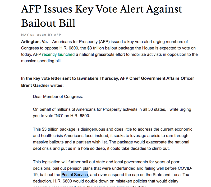 AFP wants CARES, & USPS, to die, as for-profit corporations are bailed out.