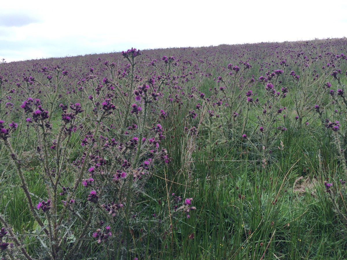 Something had dropped its lunch. A turn of the shrew took me through a field overflowing with thistles. Heading towards a tree and chapel of ease.
