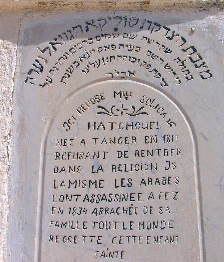 On her grave was engrave in french “Here rests Mademoiselle Solika Hachuel born in Tangier in 1817 refusing to enter into the Islamic religion. The Arabs murdered her in 1834 in Fez, while she was torn away from her family. The entire world mourns this saintly child”.