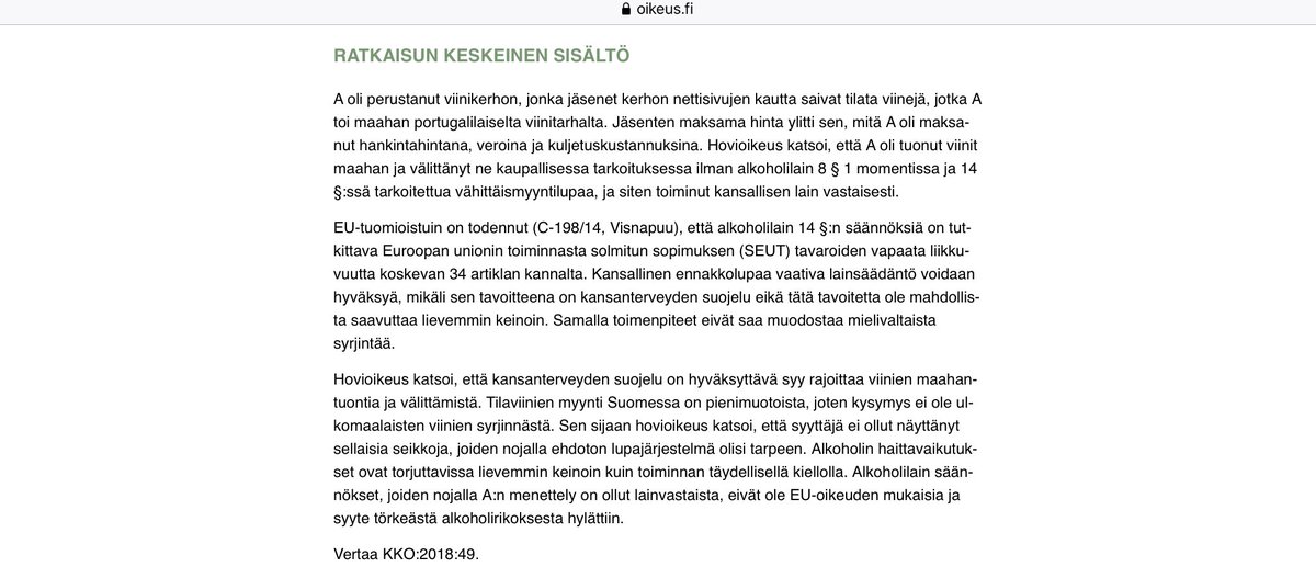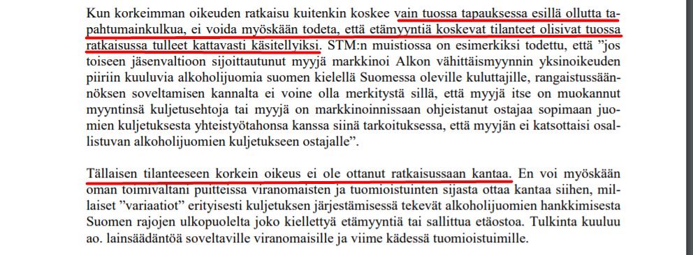 Olisipa @STM_Uutiset esittänyt oikeustilasta aidosti kattavan arvion. Vaasan hovioikeus ratkaisi EU-tuomioistuimen Visnapuu-tapauksen perusteella VaaHO:2016:3, että Suomen alkoholilaki on EU-oikeuden vastainen. Toisin kuin Alkotaxissa, kuljetuksen hoiti erillinen kuljetusliike.