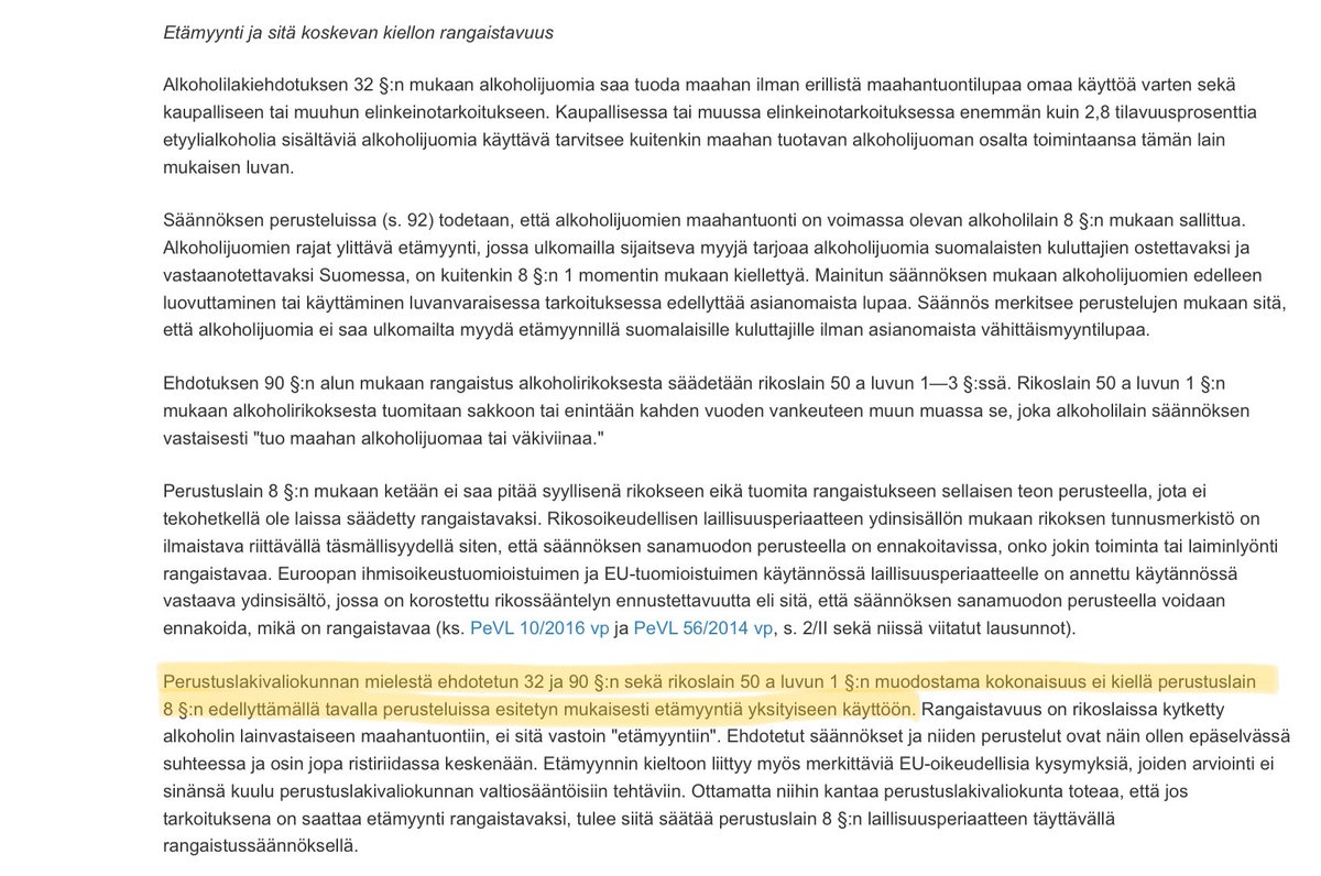 Saattaa olla, että #etämyynti on politisoitu ja karnevalisoitu - mutta kriminalisoitu sitä ei ole. Perustuslakivaliokunta (PeVL 48/2017) katsoo, ettei väitetty kielto ei ole säädetty lakiin perustuslaissa säädetyn rikosoikeudellisen laillisuusperiaatteen edellyttämällä tavalla.