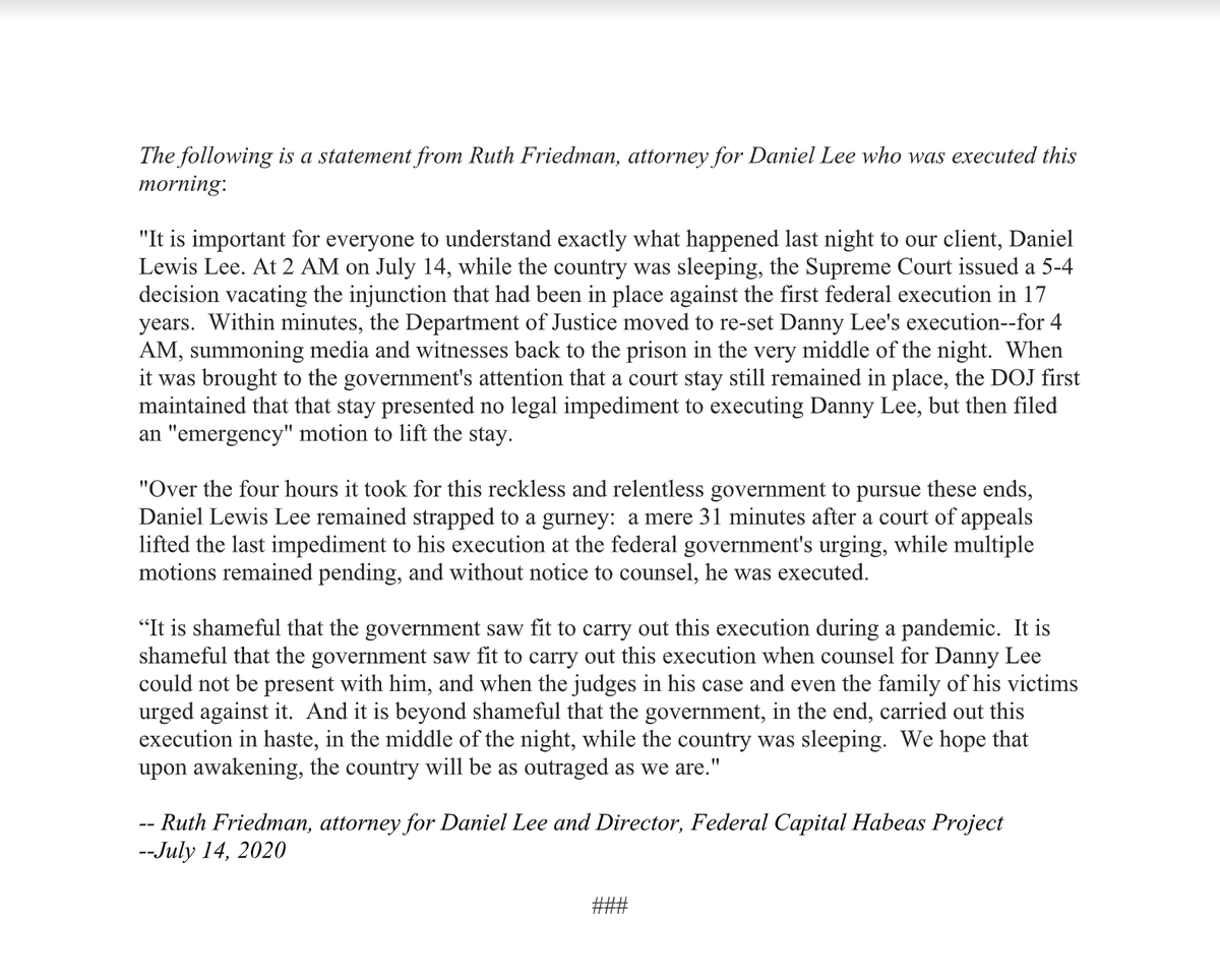 “It is shameful that the government saw fit to carry out this execution during a pandemic. ...