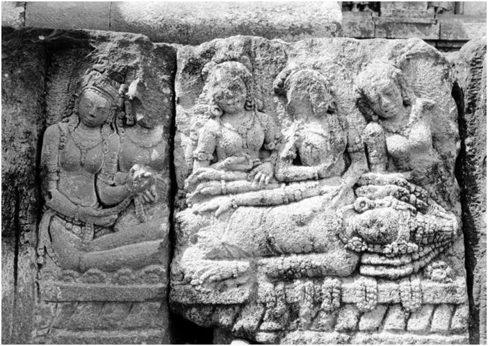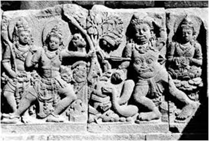 Mandodari mourning the death of Ravana. She brings a garland to lay upon Ravana's body resting on cremation wood. Bas-relief of 9th century Prambanan temple, Java, Indonesia.