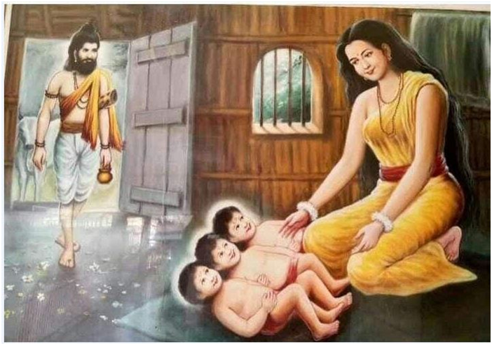அதன்படி ப்ரும்ம, சிவன், விஷ்ணு மூவரும் அந்தனர்களாக வந்து நிர்வஸ்த்ர பிக்ஷை கேட்க, அவர்களைக் குழந்தைகளாக மாற்றிச் சிறிது காலம் வளர்த்தார்.