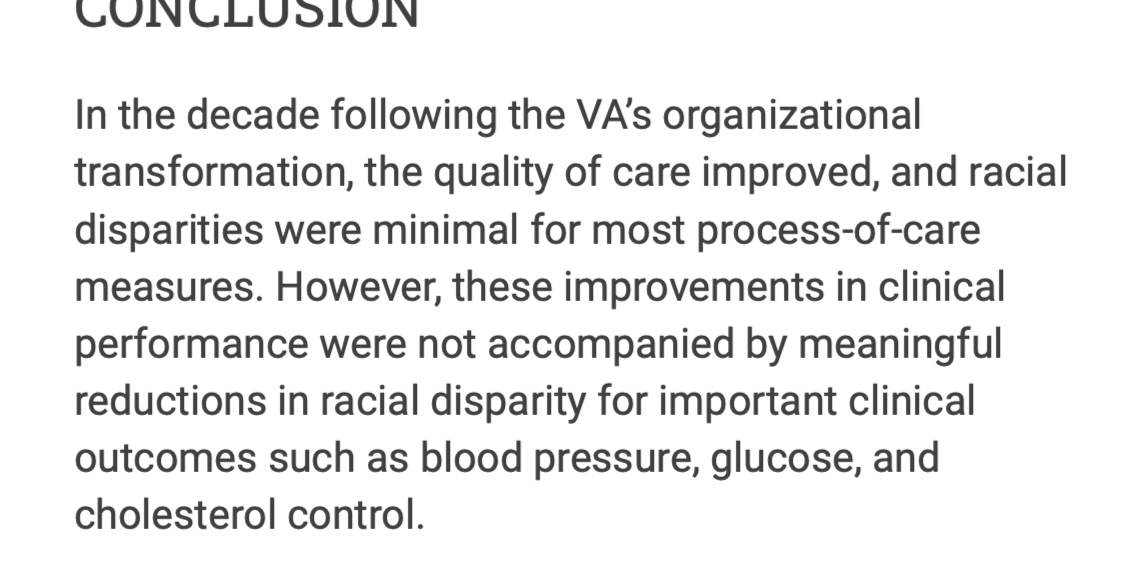 4/Implicit bias, he says, is just one aspect. When access to care is adjusted for, racial &ethnic minorities receive lower care quality. Clearly more going on there. FYI: In VA, process of care measures are similar for Whites & Blacks. But otcomes differ healthaffairs.org/doi/full/10.13…