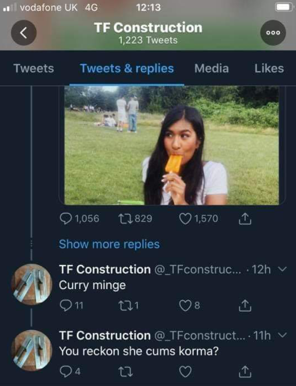.@_TFconstruction : So I hear from local sources that you've lost a massive amount of trade from this comment, one of so many racist outbursts on your timeline.