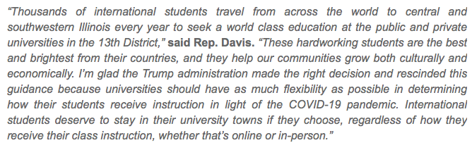 We applaud @RodneyDavis for leading a House GOP initiative to oppose the recent guidance by ICE that challenged the legal status of international students studying at U.S. colleges and universities.