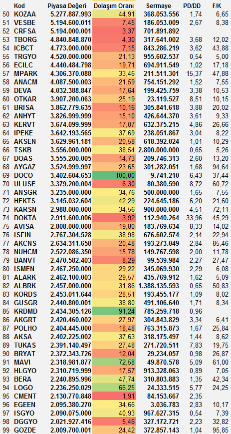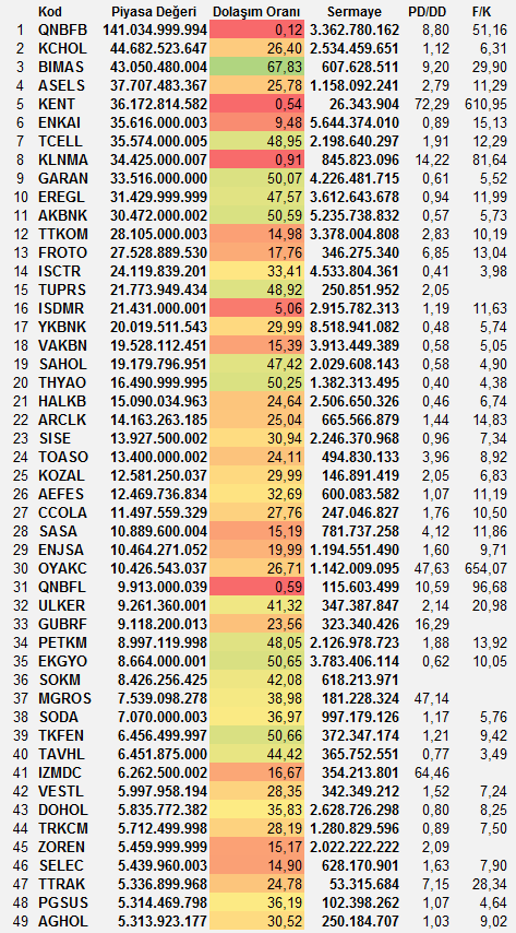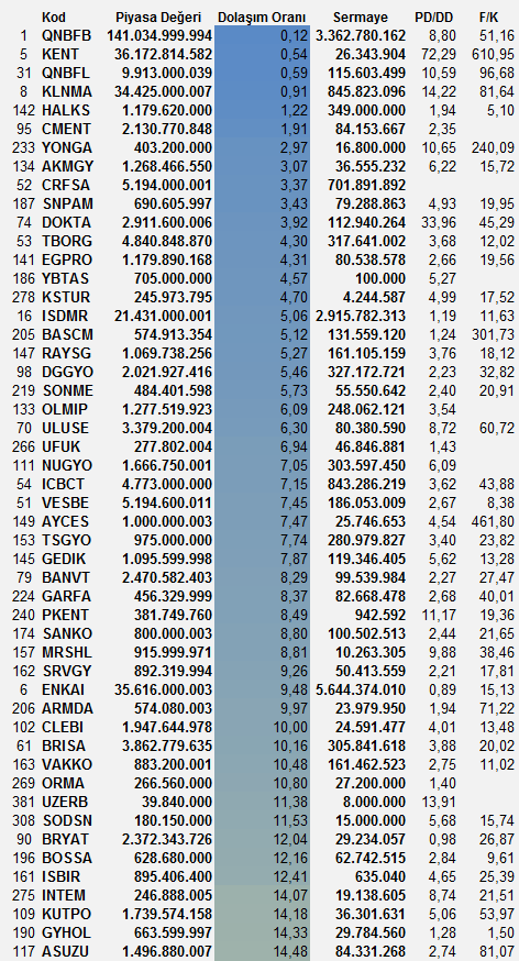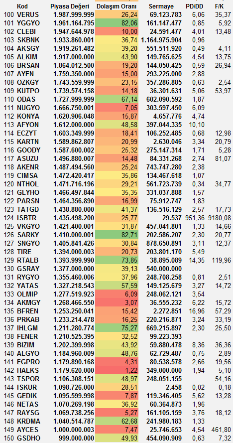 Tüm BİST'in piyasa/defter değeri en düşük oranlı şirketleri ile en düşük dolaşım oranına sahiplileri sıralamaları:
