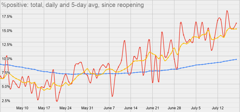 * testing is up, but cases are up more
