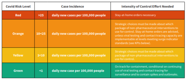 - according to harvard global health, stay-at-home orders are necessary at 25 daily cases per 100k ppl