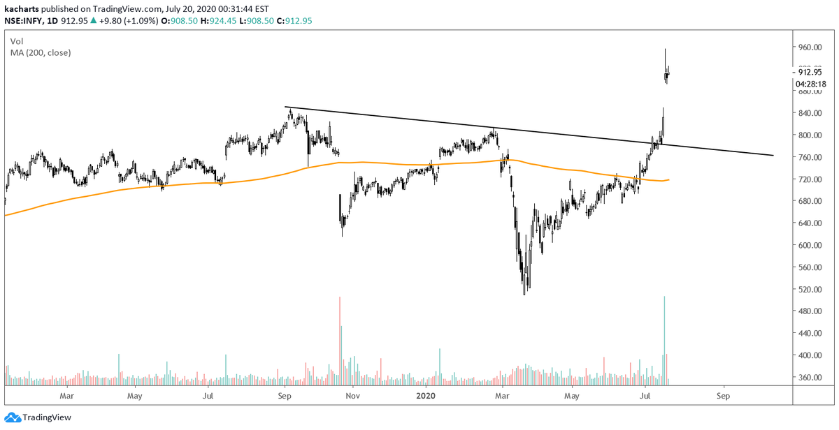 Infy came back in an uptrend, the moment it crossed .61% retracement of the fall and at the same time it closed above 200dma and sustained above it.