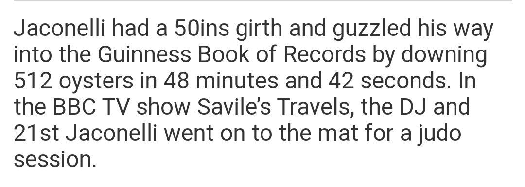 Peter Jaconelli, the King of Cornets, who Archpaedophile Jimmy Savile is said to have had a sexual relationship with, made it into the Guinness Book of Records by downing 512 oysters in just over 42 seconds.