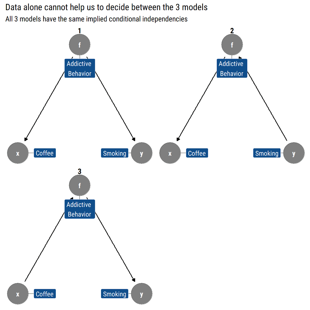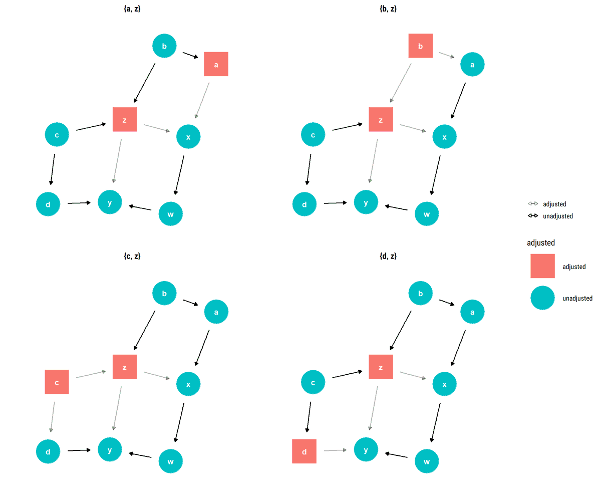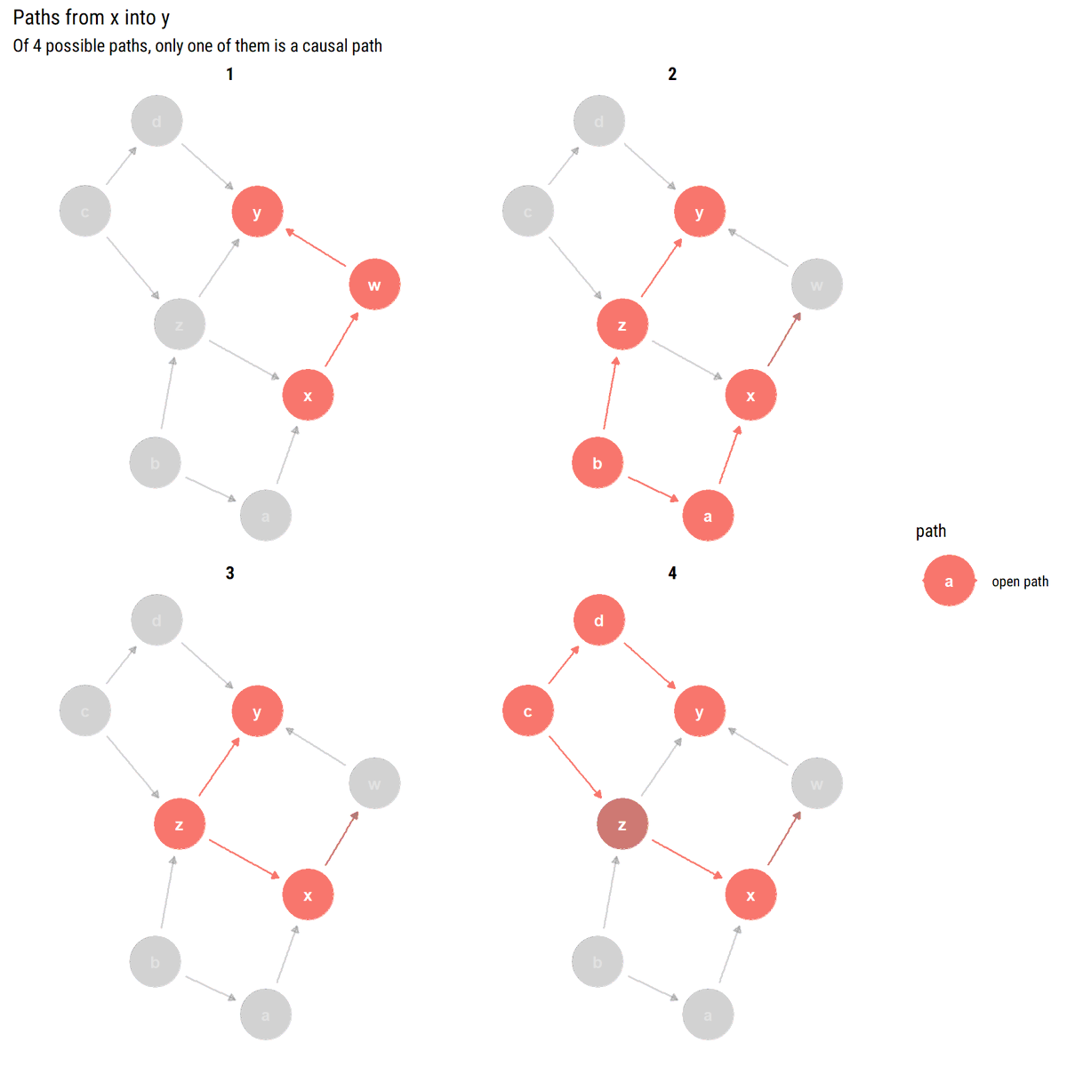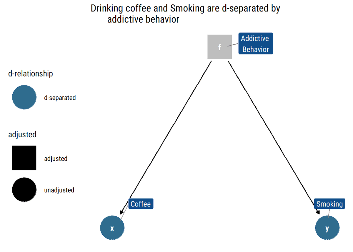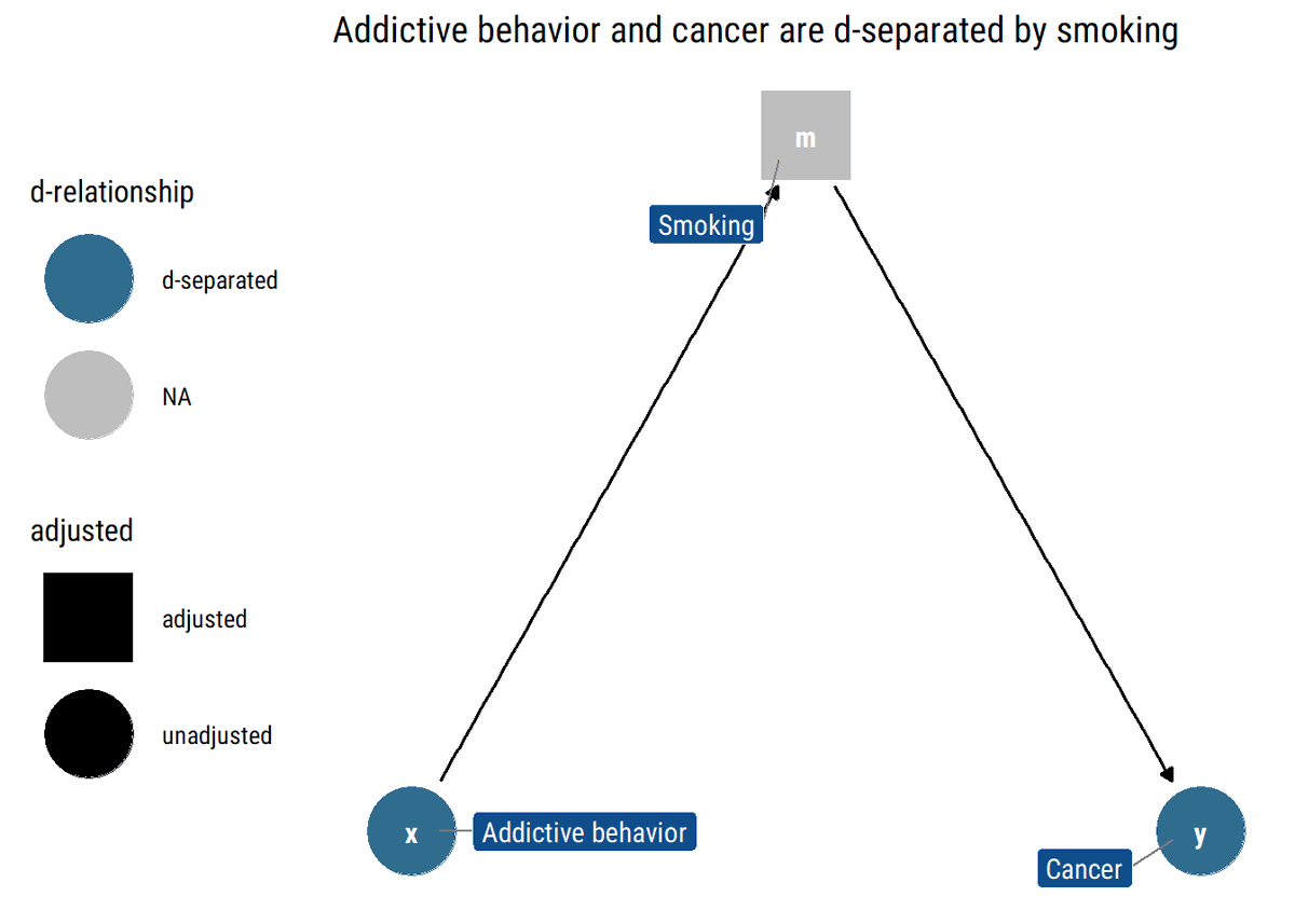 What is a blocked path? In a path that contains a chain (i→m→j) or a fork (i←m→j), the statistical information will flow from the extreme variables whenever we don't adjust by the middle variable. Thus, they will be d-separated (conditionally independent) Why? ⬇️